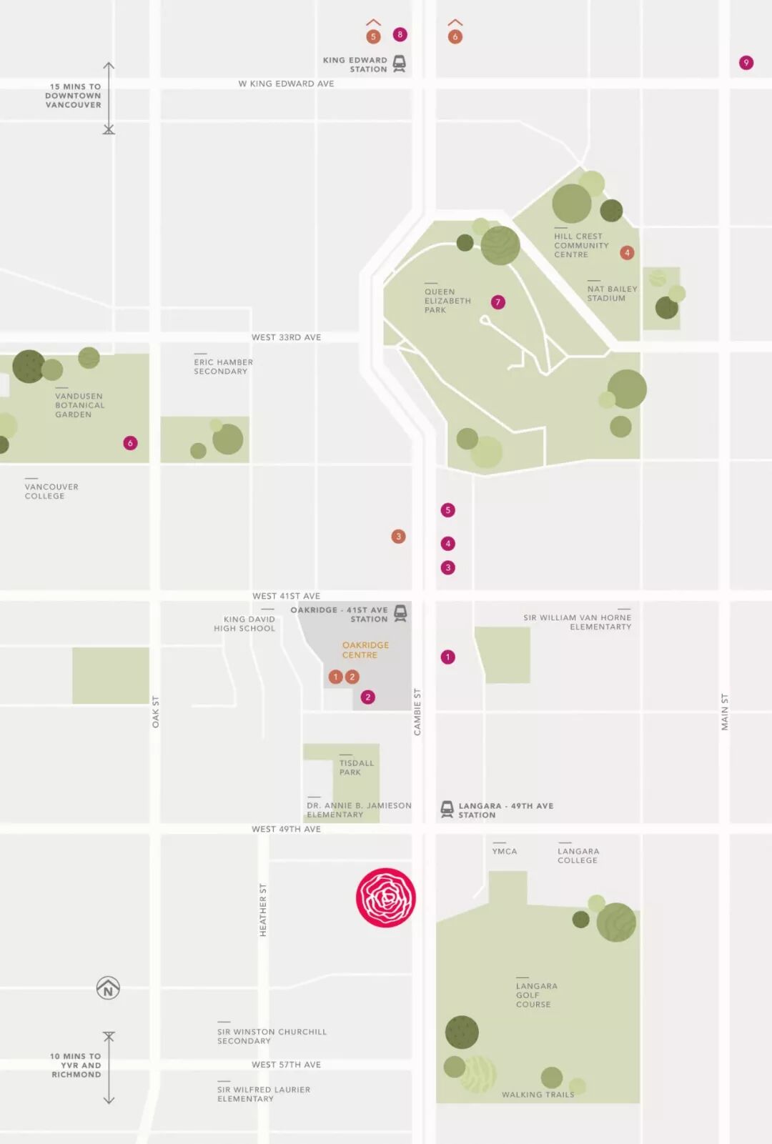 Camellia坐拥周边便利的生活,从大型购物中心,种类繁多的餐馆、景色迷人的公园休闲娱乐以及文明遐迩的温哥华学区。Oakridge Centre ——温哥华最时尚的购物目的地,近在咫尺。Langara学院,Langara高尔夫球场以及宁静的Langara步行小径带来的学习、休闲生活的便利。临近Langara 49th天车站带来便捷的交通出行方式。北行直达温哥华市中心,享受大温地区最丰富的美食和豪华的购物环境,南行则前往拥有众多中国元素的列治文地区以及温哥华国际YVR机场。