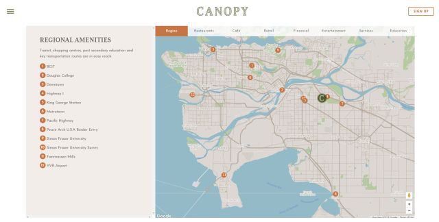 Canopy不仅邻近大自然,也同时处在动感都市之中。它位于素里与兰里之间核心的位置,Guildford镇中心近在咫尺,周围遍布超市、餐厅、精致小店,生活配套应有尽有。社区中心康体设施齐备,靠近多所优质学校,出行四通八达,1号高速路就在小区近旁,驾车去市外各处乃至美国都极为便利,符合半小时的生活圈规律。