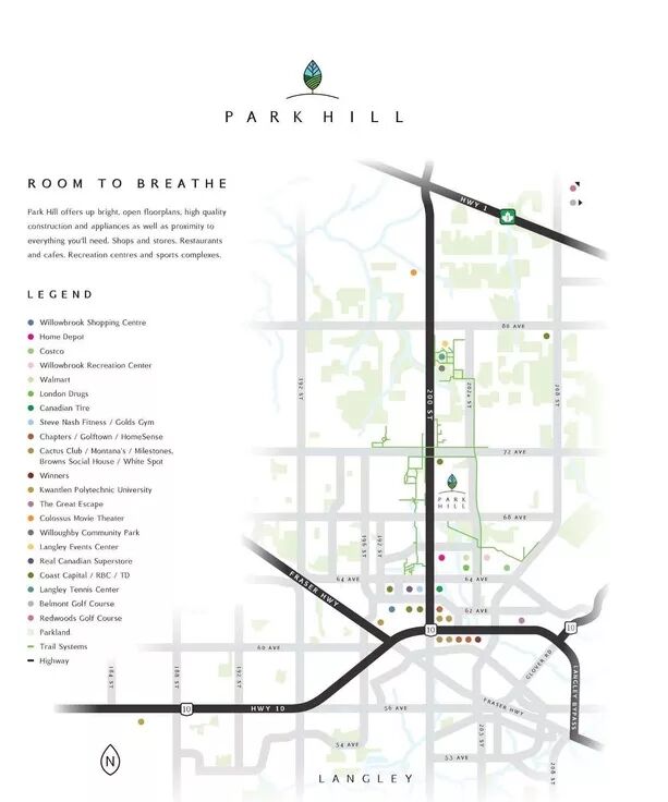 Park Hill是位于兰里Willoughby社区的公寓及联排别墅项目。有人会问,住在这里会不会生活很不方便?完全不会!Willoughby和素里东边相邻。是大温地区增长最快的社区之一。预计到 2020 年,将有50,000 居民在此定居。许多大型的连锁超市如Costco,SaveOnFoods,Home Depot,沃尔玛,Superstore,Bestbuy,Staples,Chapters 等都坐落于此。 拥有 150 多家的大型购物中心Willowbrook Mall也在这里。