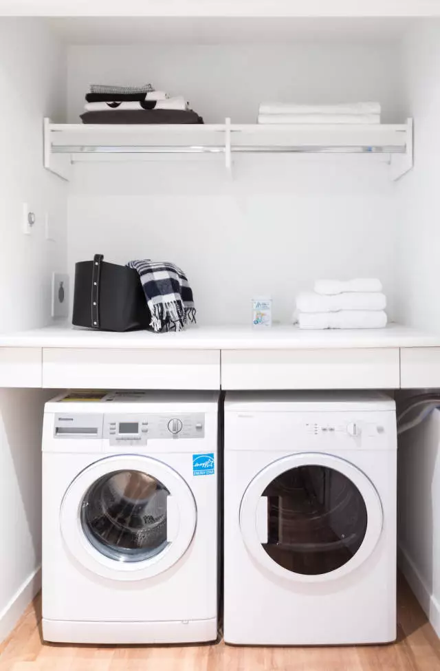 右▷ 洗衣机和烘干机摒弃传统公寓上下叠置的摆放方式,采用独立屋的并排摆放方式。同时配有挂杆、折衣台面和存储空间,使得衣物清洁也有独立完整空间来完成。