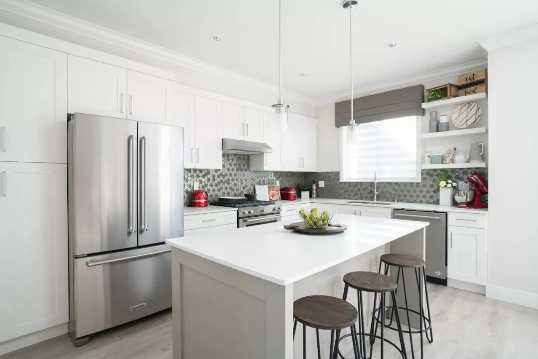 厨房采用Shaker风格橱柜面板和缓冲开关抽屉与柜门。走入式食品柜提供充足收纳空间。厨房采用Kitchen-Aid™不锈钢家电套组,包括36寸法式双开门冰箱、5眼天然气灶台、洗碗机、微波炉等。