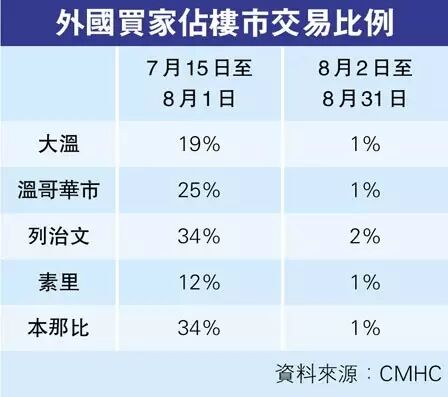 加拿大房屋及按揭公司(CMHC)公布的最新大温楼市报告显示,15%外国买家转让税实施后,外国买家佔大温楼市交易的比例狂跌,从该税实施前的19%跌至8月底的1%,可说几乎绝迹。大温各城市当中,以本那比的外国买家比例(从34%跌至1%)及列治文(从34%跌至2%)的外国买家撤退情况最厉害。