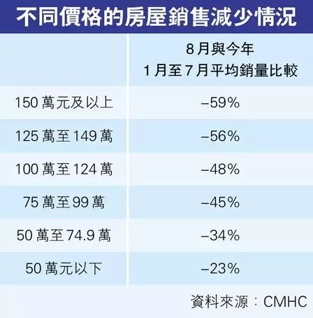 大温8月所有房屋销售数字较今年前7月平均减少40%,但150万元及以上房屋则减少59%;125万元至149万元房屋减少56%;100万元至124万元房屋减少48%;75万元至99万元房屋减少45%;50万元至74.9万元减少34%;50万元以下减少23%。50万元以下的房屋绝大多数是柏文,柏文受这次外国买家税的影响最轻微,而大温150万元以上的房屋几乎都是独立屋,受外国买家税的影响最严重。