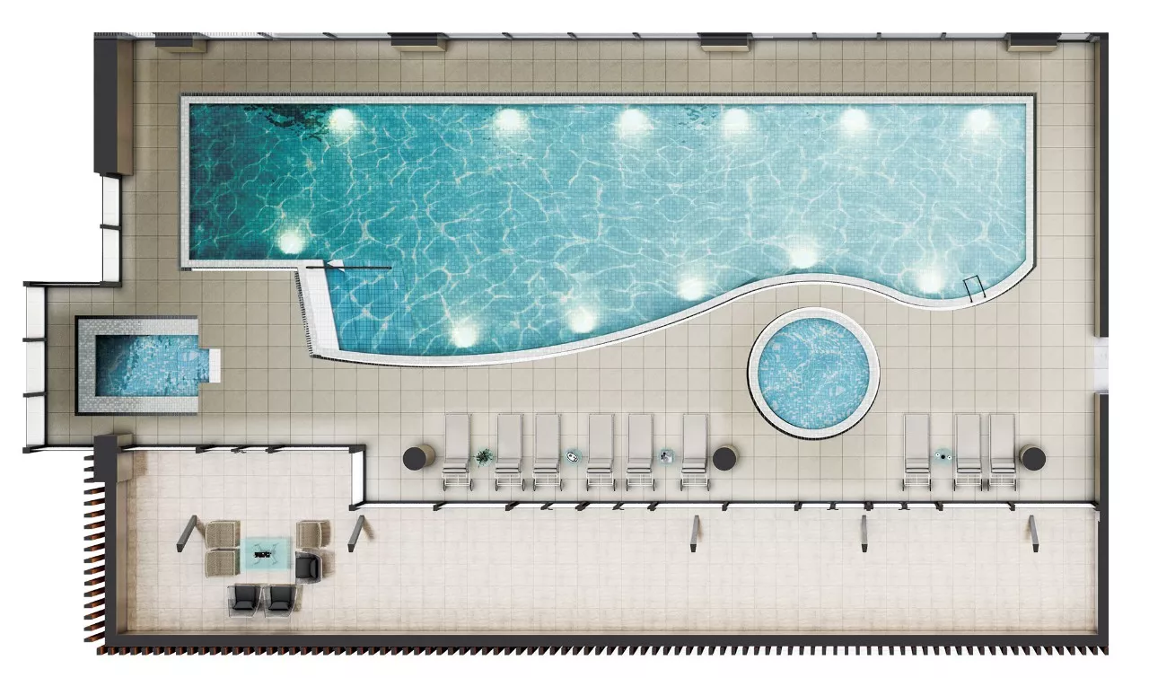 恒温泳池、蒸汽桑拿、健身中心、宴会厅、24小时物业礼宾服务以及往返加拿大线的专属业主巴士。