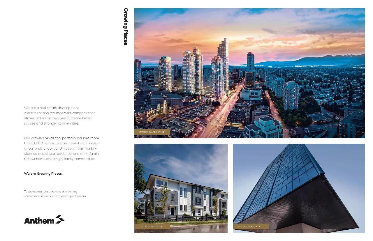 由Eric Carlson在1991年创立,Anthem是一家着重于商业及住宅地产开发、投资、管理的著名开发商。截至目前已建造完成的住宅超过11000套,著名项目包括本拿比铁道镇的Station Square、温哥华的The Qube、素里的Fleetwood Rise联排别墅等。