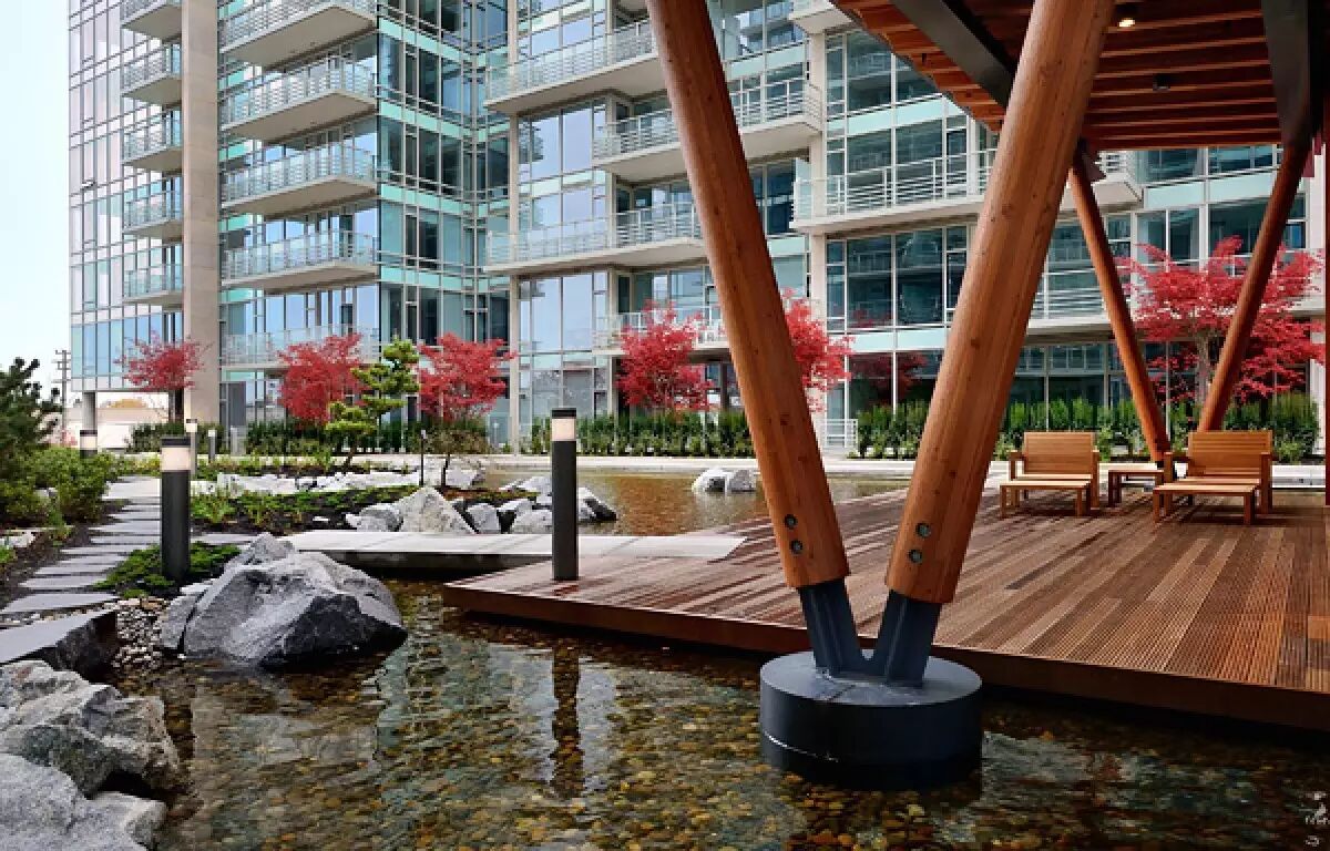 Aspac 对环境质量的追求远不止于此,社区的绿化发展到了极致。全长超过 1 公里的水滨长廊边是林荫绿地,经常看见 River Green 业主们踩着单车或慢跑经过。社区内公共艺术与周边景色融为一体,列治文市政府更将在2 River Green 的一段水岸兴建公共小型游艇码头,无论是在这里垂钓或出海畅游,又或者遛狗漫步欣赏山水,户外活动选择之多无处可比。市政府未来此外政府还会在社区周围加大建立绿化公园,River Green 的价值不言而喻。