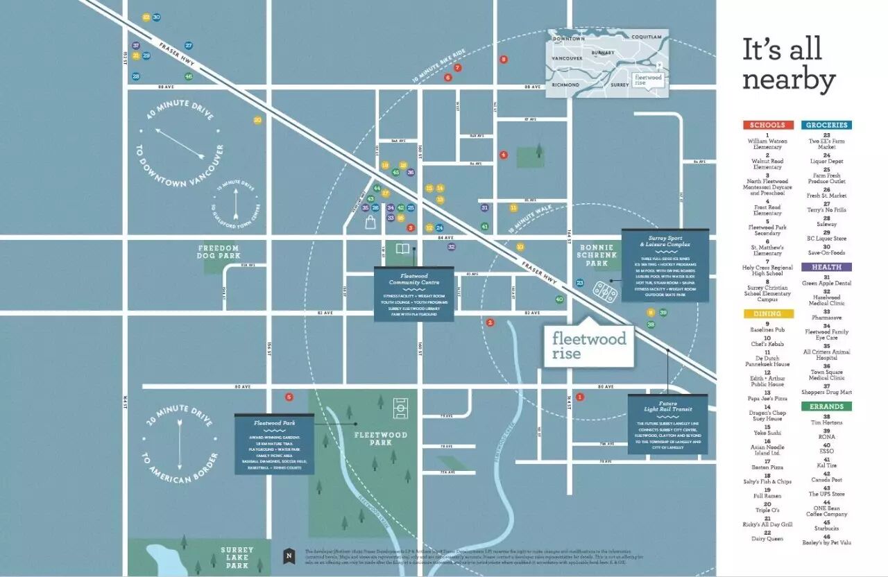 50万的起价,Fleetwood Rise距离Guilford town center只需要10分钟车程,门口的Fraser Hwy连接了整个素里和兰里地区,Fleetwood Rise的理念是,离附近左右的商铺都只需要一个简单的漫步,是的,附近有5所小学和数间诊所和药房,日餐西餐餐馆的种类也是应接不暇。