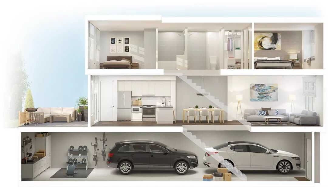 该户型为C户型的把边户型,面积略大于同等户型,而且采光较好。该户型九尺层高,空间宽阔通透。私人露台空间极大,便于您从窗外欣赏北部山脉的壮丽景色。房屋后院也可以作为孩子的娱乐场所。 中层主卧配有超大步入式衣橱,洗衣房内烘干机和洗衣机并排拜摆放,提供可以折叠衣物的空间。上层次卧洗手间采用并排式双洗手池,方便来客使用。▲ 项目外观效果图