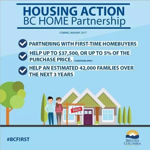 2017年1月16日起,符合标准的BC省民将可以从该省的“房主贷款与资产合营项目”(B.C. Home Owner Mortgage and Equity Partnership)获得最高额为37500加元(或房价的5%)的25年贷款。最初5年没有利息,也不需要偿付本金。从第六年起开始按当时利息还款。如果购房者增加还款额或在25年到期前还清全额,也不会被处以罚款。