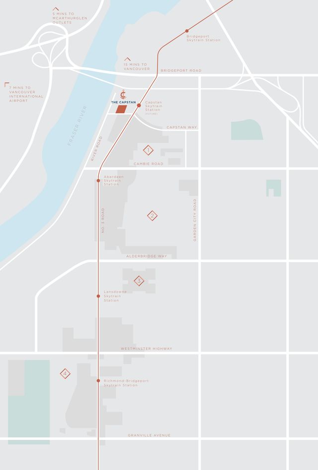 位于列治文3号路和Capstan Way交叉口,The Capstan周边新建社区众多,所处地段交通便利,生活机能完备。15分钟可达温哥华市,7分钟可达温哥华国际机场,5分钟可达McArthurGlen Outlet。临近八佰伴购物中心、统一广场、置地广场;时代坊、百家店;Landsowne中心和Richmond Centre购物中心等。
