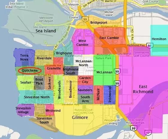 Quilchena社区位于列治文西部,西面为太平洋海岸线,东线为Railway Ave,南北界为Blundell Rd和Granville Ave。区内拥有临海高尔夫球场Quilchena Golf and Country Club,又有多个公园在此,生活环境幽静。前往排名优异的私立学校Richmond Christian十分便利。