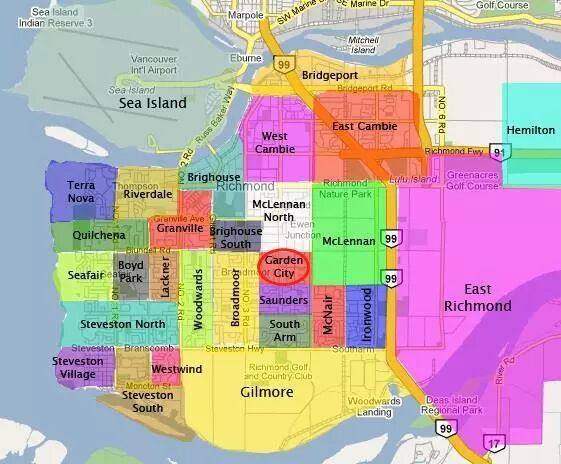Garden City社区面积不大,西起3号路,东至4号路,北起Blundell Rd,南至Fransic Rd,Garden City Rd则贯穿其中。社区内房屋类型以独立屋和联排别墅为主。凭借3号路和Garden City Rd两条主干道,前往各地区十分便利。步行可达占地23.76英亩的Garden City Community Park。列治文排名第1的公立学校 R.C. Palmer中学就位于该区。