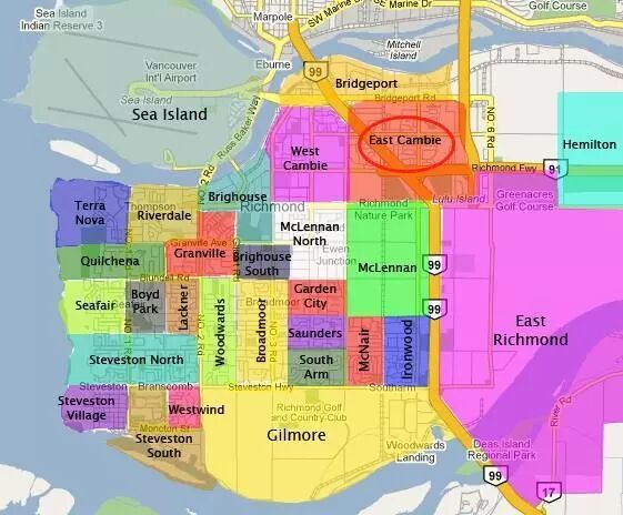 East Cambie社区位于列治文东北部,东起Knight St,西至4号路,北邻Bridgeport Rd,南止Westminster Hwy。该区交通便利,周围餐馆林立,商场等休闲设施齐全。列治文市最大的市立野生公园Richmond Nature Park位于此,占地200多英亩,是市民外出运动休闲的绝佳场地。