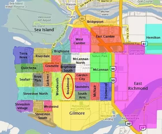 Boradmoor社区位于列治文市市中心繁华地段,北起Blundell Rd,南至 Steveston Hwy,西邻Gillbert Rd ,东至Garden City Rd,3号路横穿其中,交通生活便利。最好的私校之一St Paul’s中学,以及排名前列的公校W D Ferris和John T Errington中学都在这里。该区是列治文市最好也最贵的社区之一,也是最早开发的区域之一,过去以独立屋为主,近些年不断开发的新公寓和连排使得该社区成为列治文市最热门社区之一。