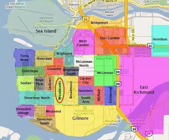 Woodwards 区位于2号路以东,Gilbert Rd以西,Blundell Rd以南,Steveston Hwy以北。这个区靠近Richmond Centre购物中心,前去购物用餐极其方便。该区内有包括London Park在内的三个公园,提供了休闲娱乐消遣的好去处。著名私立学校Richmond Christian School, 以及公校Jessie Wowk小学,James McKinney小学等排名前列的学校都在该区附近。