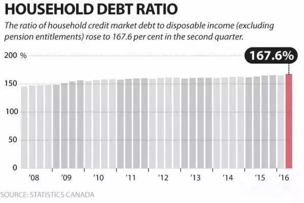 2016年第二季度的家庭负债率为167.6%,也就是说加拿大家庭每拥有100加元的可支配收入,就有近168加元的债务。