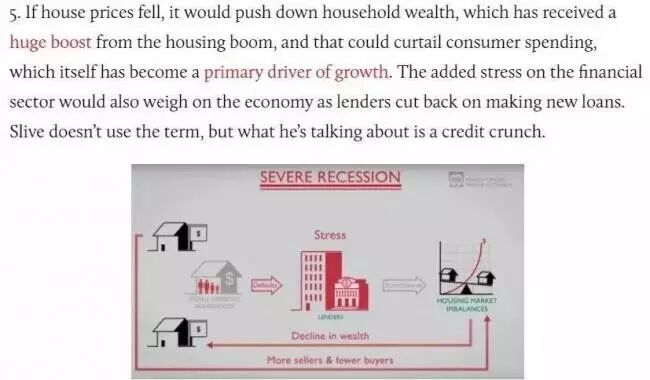 如果房价下跌,将会推动个人家庭财产缩水。过去几年中,家庭财产在房地产市场繁荣过程中已经取得巨大提振,而家庭消费支出也因此被压缩。但在通常情况下,家庭消费支出是促进经济增长最重要的动力。