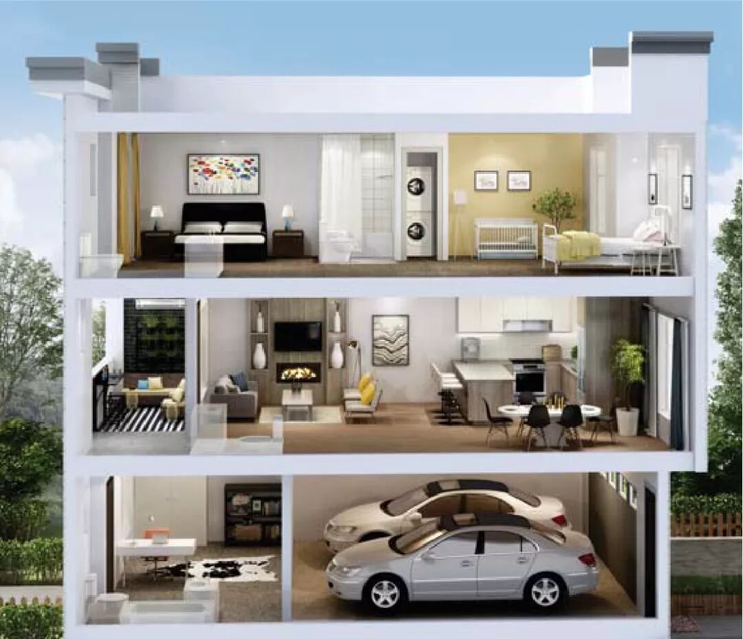 ▲ 项目室内效果图客厅、餐厅和厨房采用耐用的复合木地板,卧室、上层走廊、楼梯则采用地毯,卫生间和洗衣房则采用瓷砖。部分户型洗衣机和烘干机并排摆放,提供了折叠衣物的空间。