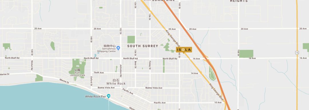 ▲ 项目位置示意图Isola位于南素里中心地区,紧邻King George Blvd与99号高速公路。King George Blvd是连接素里到新西敏两座城市的主要干线。99号高速公路不光连接了美加边境,其部分路段更是集中了温哥华所在的不列颠哥伦比亚省最美丽的风景:雪山、森林、瀑布、海湾、湖泊,而被评为世界最美驾车路线-「海天公路」。