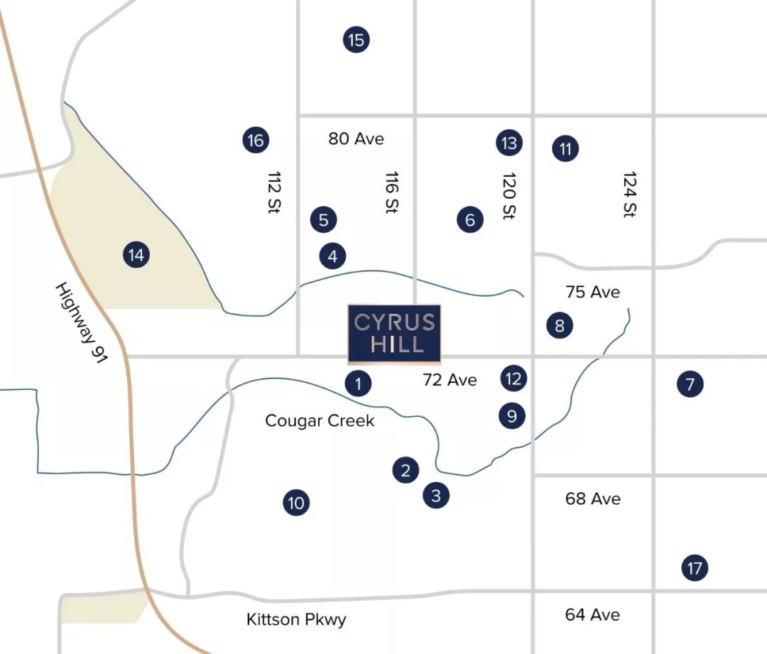 Cyrus Hill项目背靠Cougar Canyon环境保护区,森林广袤植被郁郁葱葱,Cougar Creek蜿蜒流淌,从小区出发步行便可到达。自驾车5分钟即可到达面积达3500公顷的Burns沼泽及三角洲自然保护区。保护区内不仅有多条徒步步道和露营场地,还有各种活动和课程以及夏令营。
