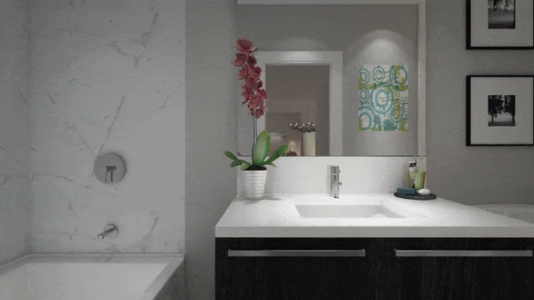 为了便于使用,卫生间有两个出入口,无论是在起居区域或卧室都可便利前往。配有标准的座便器、洗手池、浴缸、淋浴莲蓬头的四件套,功能齐全。悬浮洗手台不仅外观现代,也便于清洁。