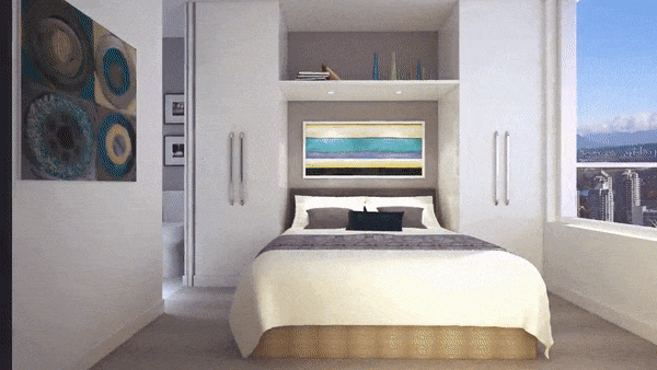 卧室通过推拉移门与客厅相连,地面铺有脚感舒适的地毯,采用定制床头衣柜及搁板设计,提供更多衣物收纳空间,业主也无需另行配置床头柜及床头照明。