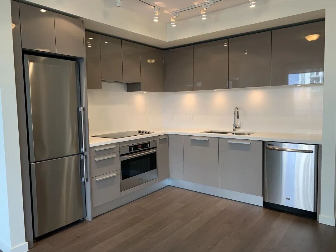 厨房为经典L型,橱柜采用时尚光面灰棕面板,轨道射灯与橱下筒灯照明营造温馨氛围。厨房家电包括Fulgor陶瓷电磁炉、Fulgor嵌入式自洁净烤箱、Maytag不锈钢洗碗机、Blomberg不锈钢冰箱。整排L型吊柜和水池台下柜及抽屉提供充足的收纳空间。