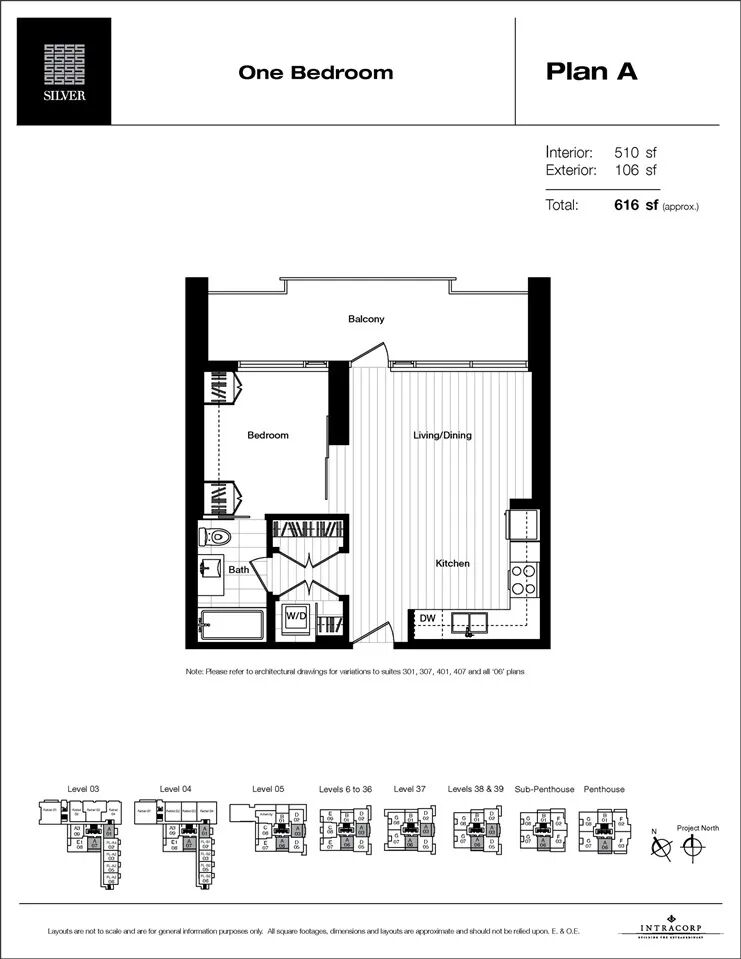 本套单位为10层东向一房户型。户型方正,室内面积为510平方英尺(约47平方米),搭配106平方英尺(约10平方米)户外阳台,有本地知名开发商Intracorp于2015年建造完成。