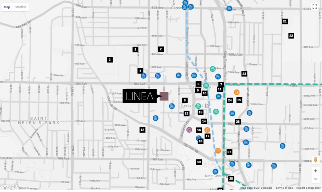 Linea位于素里市中心,距离Surrey Central天车站仅5分钟步行路程,距离SFU素里校区和Central City商场不到10分钟步行路程,前往学校、公园、健身会所、商店、餐馆、医院等都十分便捷。