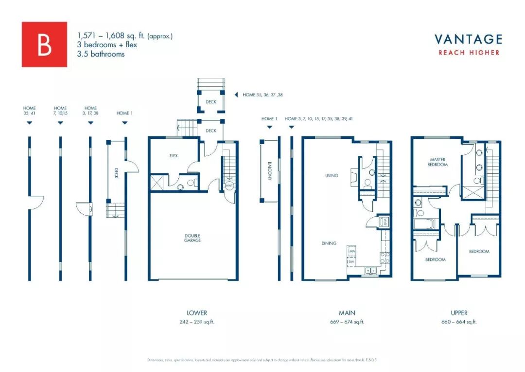 Vantage项目由开发商Sunmark建造,共提供62套3层联排别墅,面积范围从1532 - 2029平方英尺不等,包含3到4个卧室和室内并排双车库,房屋外部装有LED檐下照明。