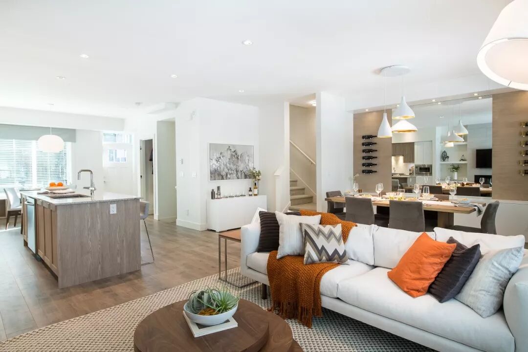室内设计现代温馨,提供明暗两个色系的装饰选择。客厅层高九尺,宽敞明亮。加大尺寸的窗户均采用双层Low-E辐射玻璃,为室内带来充足自然光线的同时阻挡了紫外线的照射。主层生活空间采用木地板,楼梯和卧室则铺以地毯,柔软而舒适。