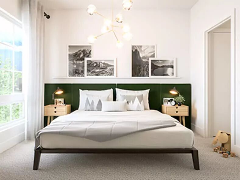 两间卧室分列于两头,互不干扰。卧室内居住空间面积十分可观,都能摆放下双人床+双床头柜,并且两间卧室预留了一个放置梳妆台的空间。主卧内采用双开门衣柜,可方便男女主人分区放置各自衣物。