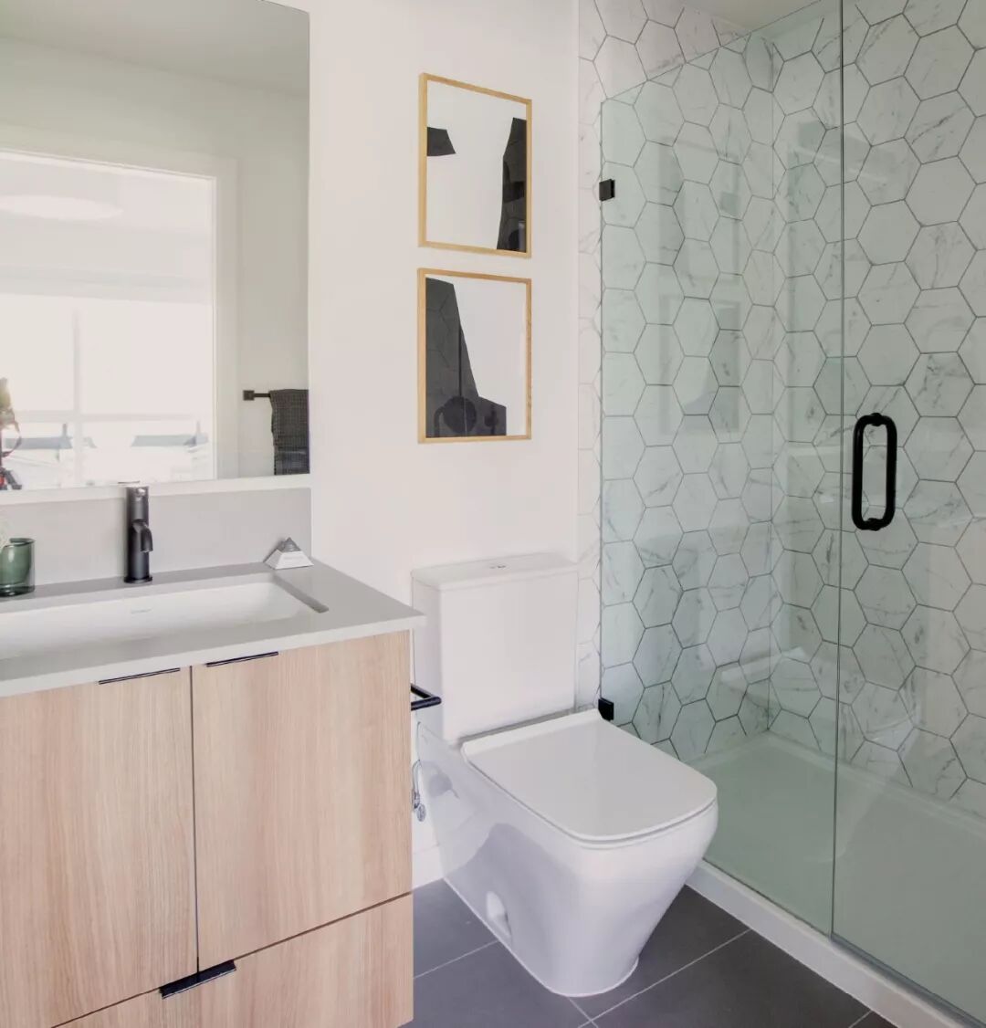 Founders Block North为业主设计有流线型浴室,地面铺有暖灰色瓷砖地板,安全防滑。浸入式浴缸或无框淋浴间均有六边形大理石外观瓷砖环绕,并有黑色哑光装置点缀,时尚美观。主浴室装有无框玻璃淋浴间,可享受如Spa般的水疗设施,部分户型为双水槽洗手池。