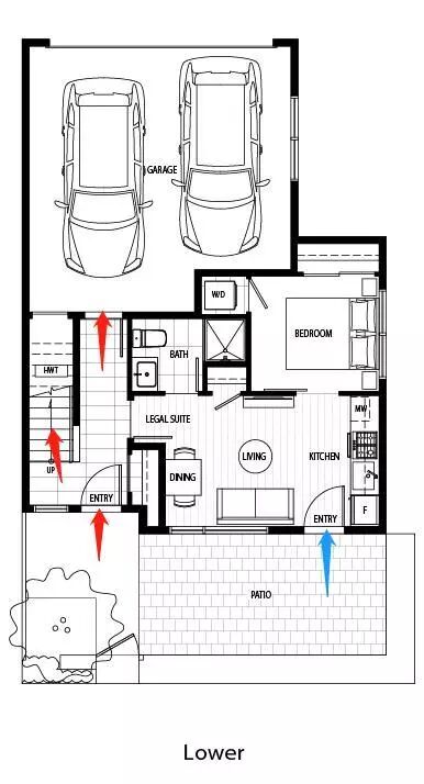 接下来我们来看业主生活区。跟随红色箭头进入室内后,玄关为传统式的Mudroom,铺有地砖易于清洁。在雨量充沛的温哥华十分实用。雨雪季节,沾湿的鞋子可摆放于此,外套则可以顺手收纳于入口处的衣橱。楼梯前的空间或前往车库的过道一侧可灵活摆放穿鞋凳或鞋柜。该套单位车库为并排双车位,并可收纳工具或运动装备。